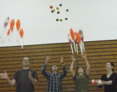 Wir üben das Jonglieren mit drei Bällen und sind schon bei den ersten Tricks.
