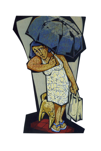 Aber auch Alltagsgeschichten werden künstlerisch herausragend umgesetzt: Eine Frau, sommerlich gekleidet, mit Tragetasche und Regenschirm. Eine Katze schmiegt sich an ihre Beine. Ein Szenario in der Linienführung, die Henriques Lemes‘ Motive so unverwechselbar macht. Der Künstler macht alltägliche Szenen zu etwas Außergewöhnlichem. Dazu gehört auch das Motiv, das den Betrachter schmunzeln und entspannen lässt: Die kleine Pause zwischendurch. Ein Stillleben nicht nur mit Sofa, Frau und Katze.