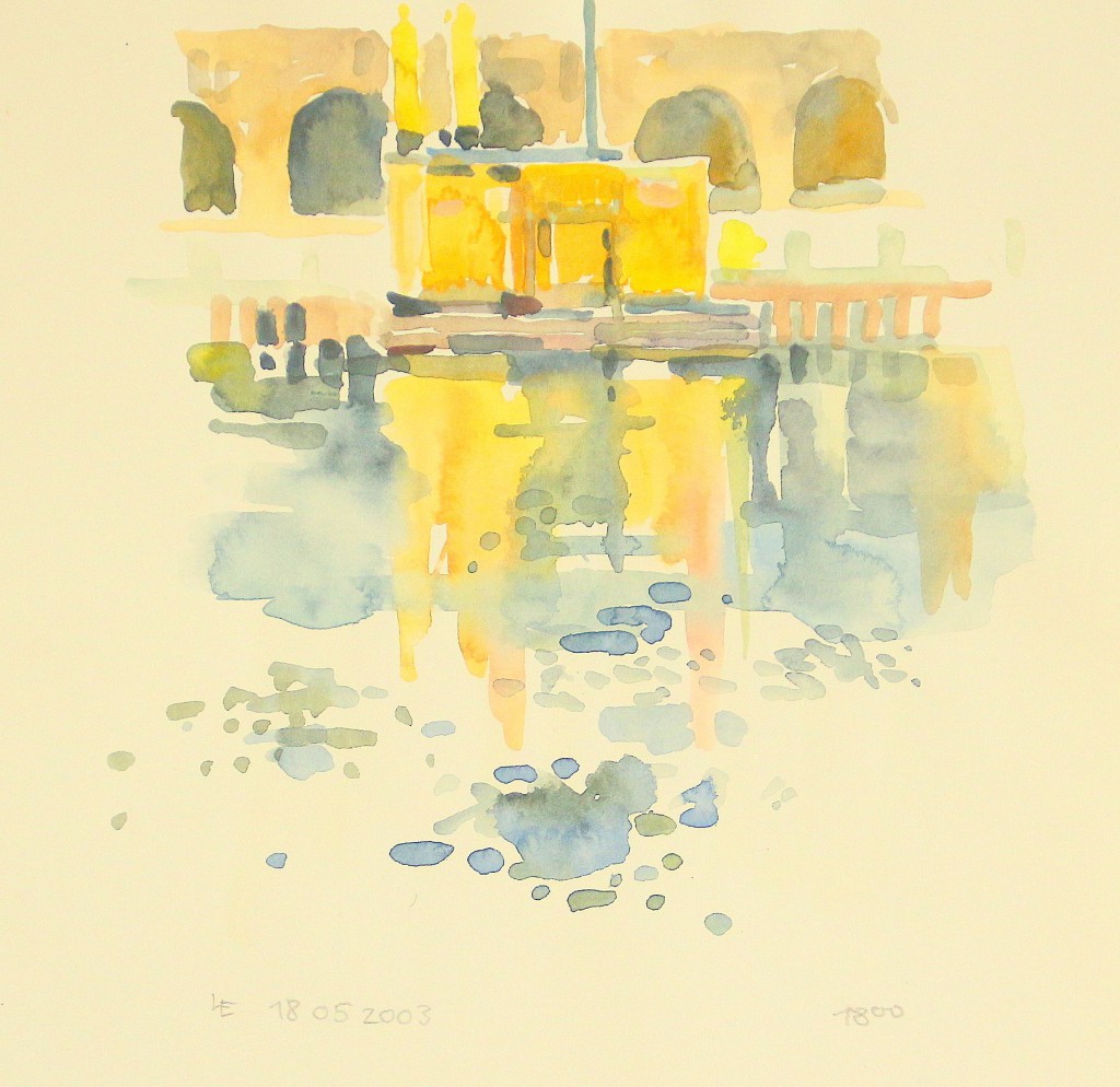 „Arbeitsponton vor Arkaden“, Aquarell, 30 x 30 cm, 18.5.2003,18.00