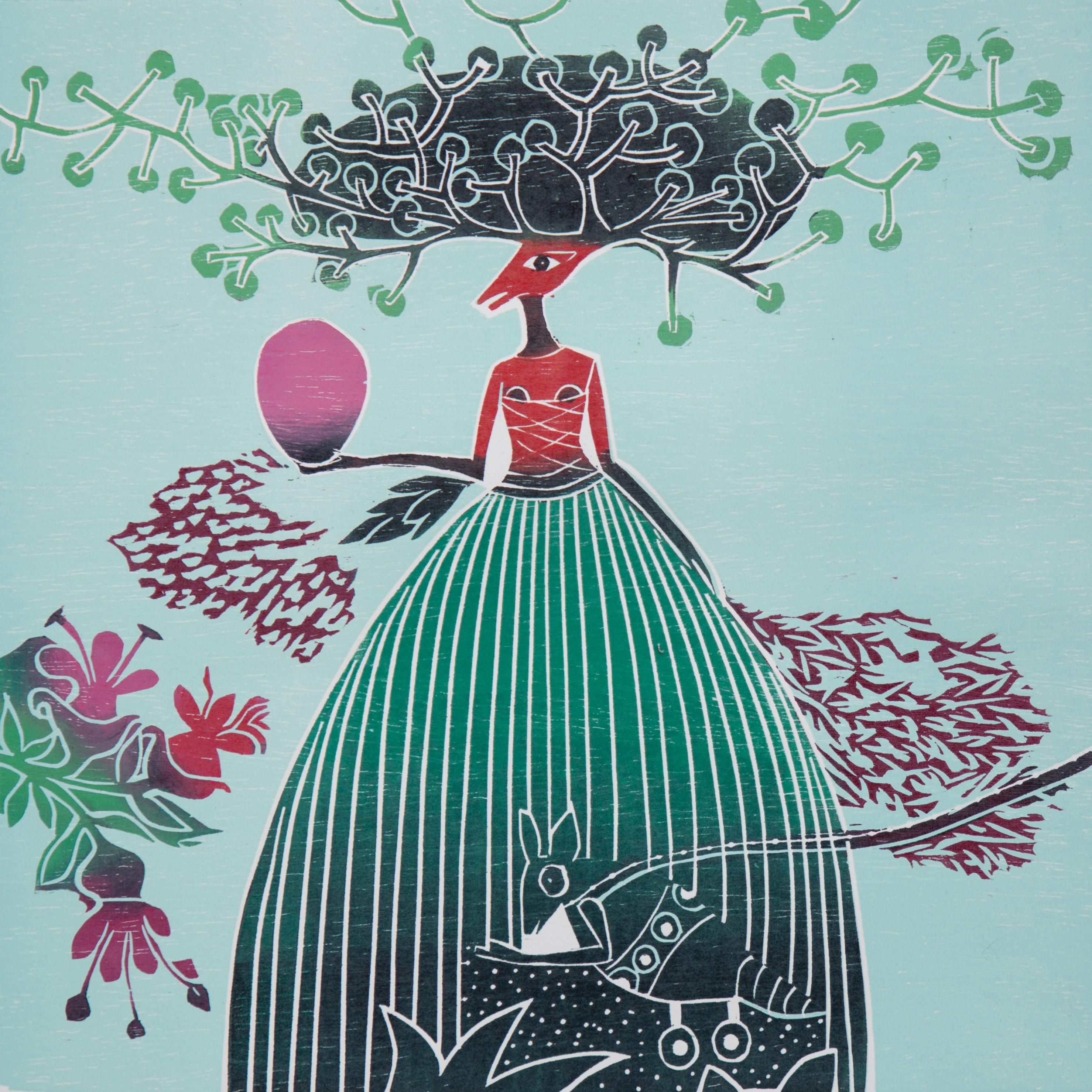In diese Bilderwelt einzutauchen heißt für den Betrachter, sich auf eine spannende Entdeckungsreise zu begeben und mitten im festlichen Trubel auch eine ganz besondere Figur zu entdecken: Stark und unerschütterlich steht eine weibliche Gestalt. Für die Künstlerin ein Symbol für Natur und Beständigkeit, fest verwurzelt in Traditionen und Mythen. Sie sagt: „Sie ist für mich eine starke Frau wie ein Baum, verbunden mit Mutter Erde. Für mich ist es auch eine Erinnerung an meine Mutter, die immer stark war und auch jetzt, mit 94 Jahren, immer noch sehr stark ist.“