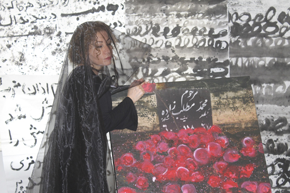 Das in der Vorbereitung aufgenommene Foto zeigt die Künstlerin mit einem schwarzen Schleier, dem Zeichen der Trauer. Mit ihrer Hand stützt sie das übermalte Foto vom Grab ihres Vaters mit leuchtend roten Rosen. Im Hintergrund befinden sich die Papierbahnen mit Gedichten und Lockenzeichnungen. „Ich habe in der Trauerzeit sehr viele Locken verloren.“